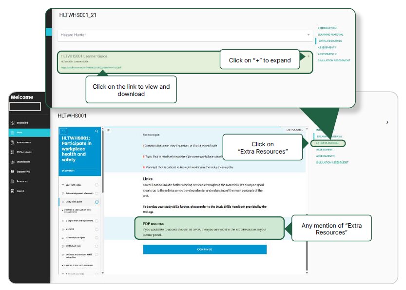 The Extra Resources section contains any supporting files provided for your unit. This may include a PDF copy of the learning material (if available), as well as templates, images, diagrams, worksheets, checklists, and additional reading.